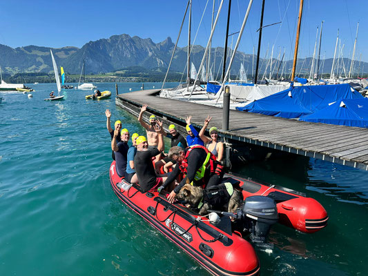 · Ein Rettling zu zweit mittels Hebegriff gemäss Ausbildungsunterlagen schonend aus dem Wasser geborgen wird.